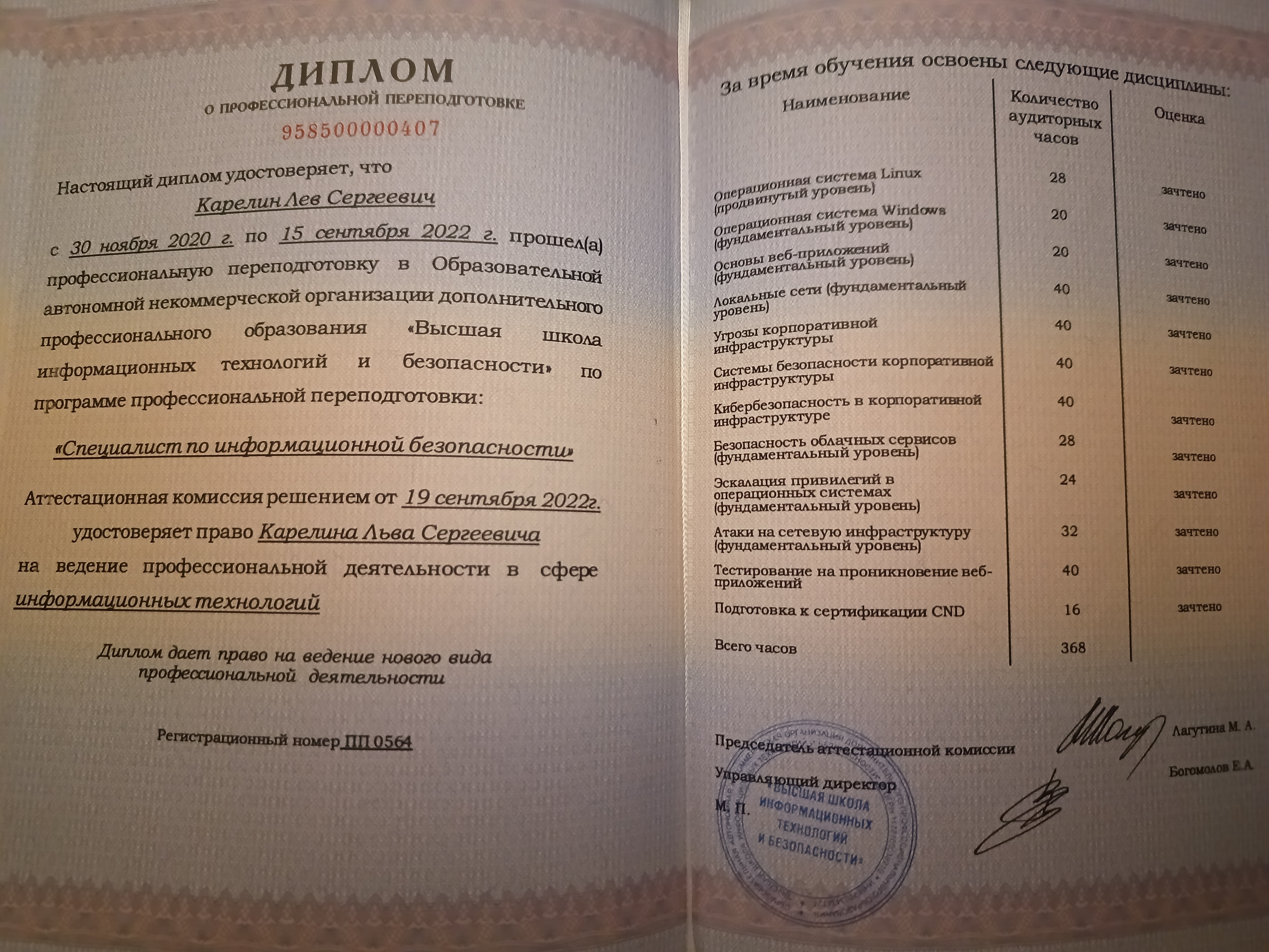 Дальше — аудит Wi‑Fi 📡: собрал несколько машин, свистки, изучил Unix.Странно ,что и по сей день производят роутеры с WPS,который высчитывается на калькуляторе(не забудте его отключить,если этого ещё не сделали),поверхностно поизучал SDR. Далее обучался по профессии "Информационная Безопасность Hackeru" в Москве (2 года,имею диплом). Было тяжело — времени ,как всегда не было, приходилось работать в такси до ночи 🚕,огоньку добавляли неадекваты попадающиеся время от времени. Была сделана пауза ,для закрепления знаний,тренировок